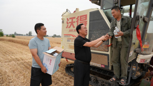 “何坤,今天是茄丁捞面,快下来吃了再干。”在弯赵村一块麦田里,张运振叫住正在收割小麦的何坤。往嘴里扒拉了一口捞面条,何坤憨笑着说:“这么热的天,还辛苦您给我们做饭、送饭,真的太感谢了!”张运振回应道:“都是一家人,一家人不说两家话。”